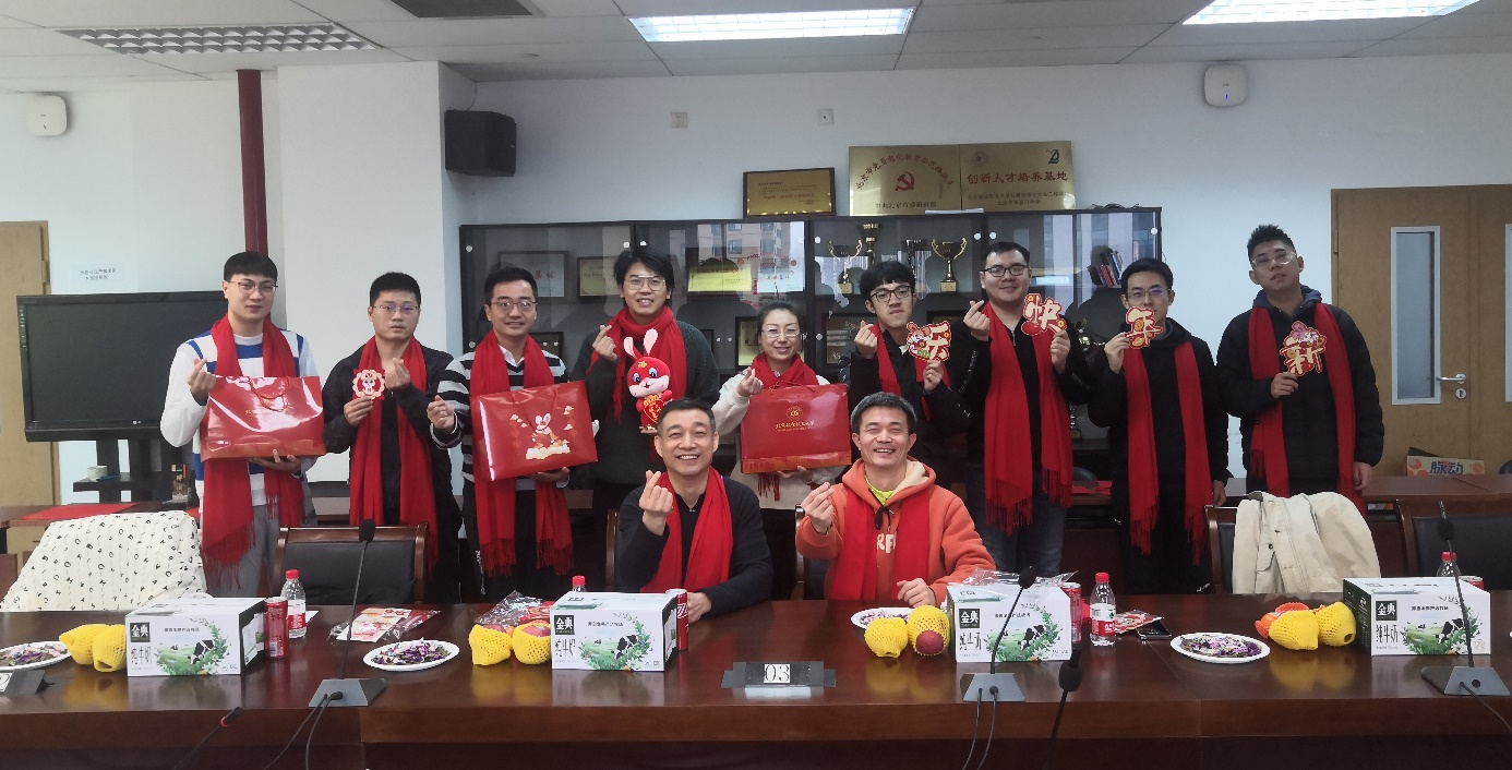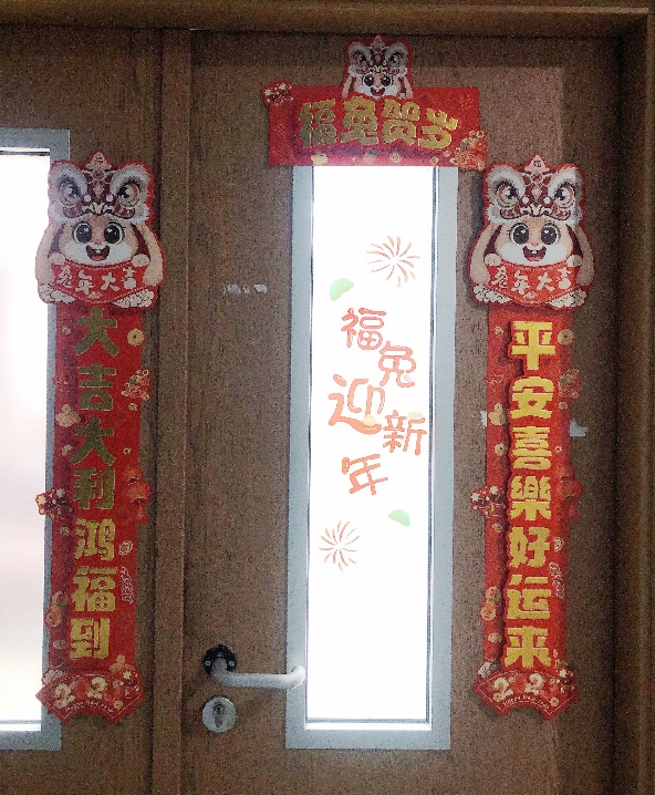 新主楼B707,“福兔贺岁”的对联孕育着宏福好运,“兔年大吉”的窗花温馨而又可爱,欢快的乐曲烘托着快乐的心情,红围巾、大礼包、心想事“橙”的柑橘,“苹”安喜乐的红富士,张灯结彩,喜气洋洋。