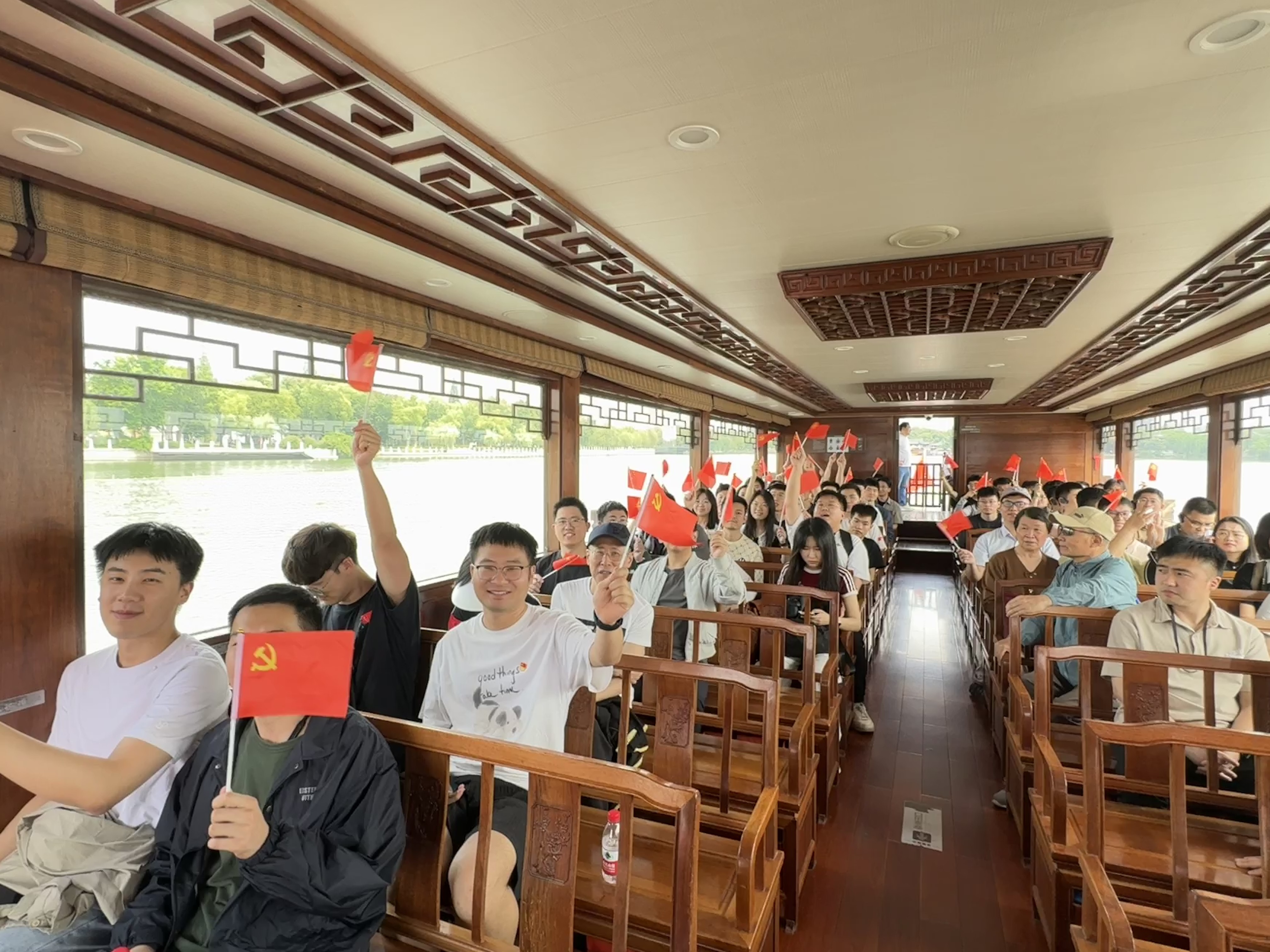 红船旁的烟雨楼,同样是南湖的重要景观。烟雨楼因其独特的江南水乡风韵而著名,历史悠久,承载了丰富的文化底蕴。同志们在这里了解了南湖从古至今的发展历程,感受革命历史与自然风光的完美融合。烟雨楼旁的红船和南湖的美景相得益彰,给大家留下了深刻的印象。