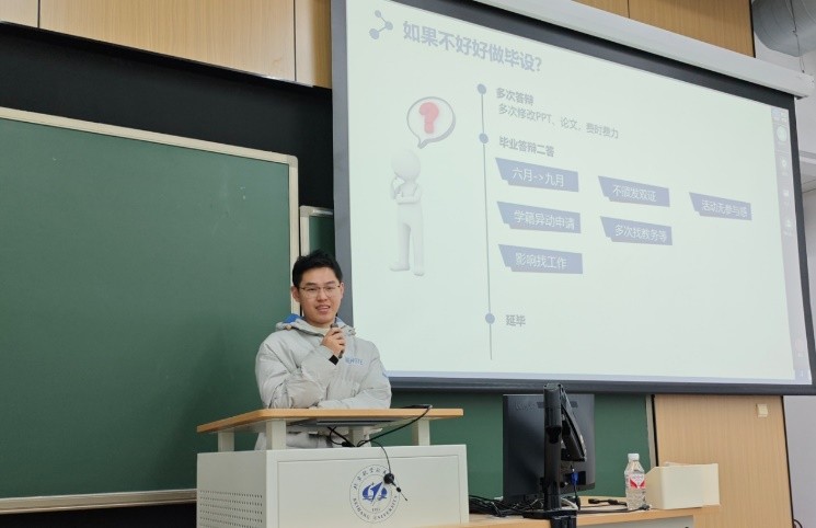 李祥宇同学从员工的角度出发,分享了自身的毕业设计经历以及在完成毕业设计过程中的心得和体会。他提醒同学们,在毕业设计的过程中,应积极与导师进行沟通,及时反馈研究进展和遇到的问题。导师是员工的第一指导者,通过与导师的交流,员工能够得到及时的指导和帮助,避免在研究过程中走弯路。李祥宇的分享为同学们提供了更具实操性的建议和经验,帮助大家更加直观地了解毕业设计的实际情况。