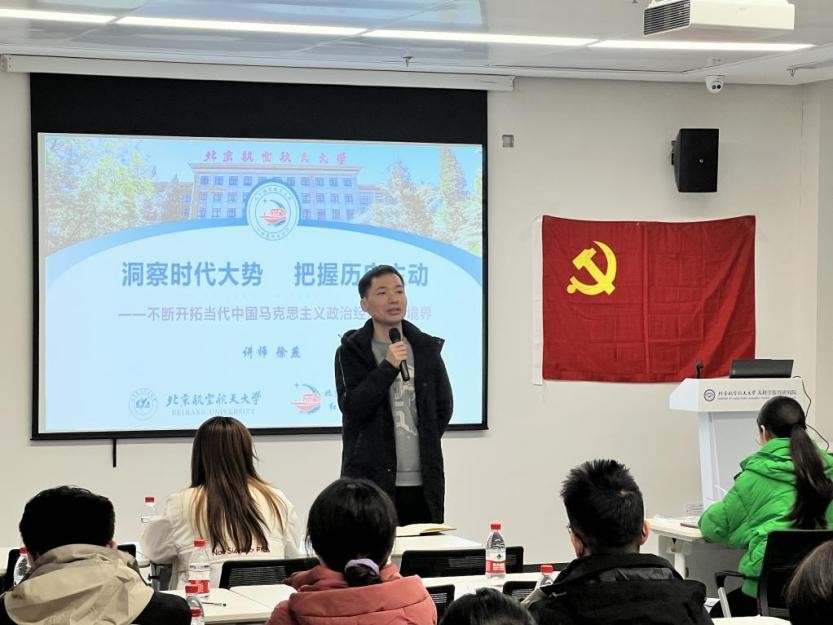 为深化理论学习,推动马克思主义政治经济学的学习与实践,本次活动邀请了北航红船星河宣讲团徐燕讲师,作题为《洞察时代大势 把握历史主动——不断开拓当代中国马克思主义政治经济学新境界》的专题党课。徐燕同志从理念是行动的先导、理论实践融合共进、新理念引领新发展和新时代迈向新征程四个方面深刻阐述了马克思主义政治经济学的核心内容及其中国化的最新成果,为大家清晰解码了马克思主义政治经济学。