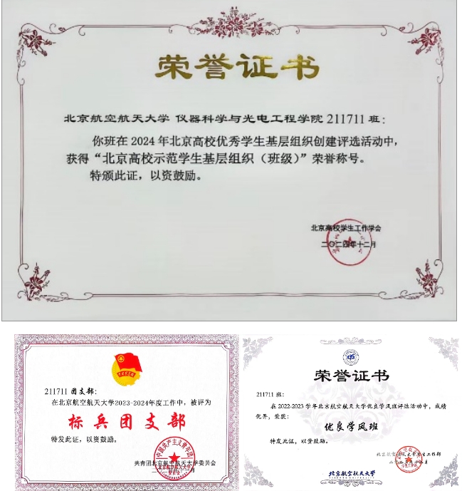 在同学们的共同努力下,班级曾获评如“标兵团支部”、“优秀团支部”、“优良学风班”等多项校级荣誉称号。2024年12月,211711班再添两项北京市集体荣誉,获评北京高校示范员工基层组织(班级)与北京市先进班集体。