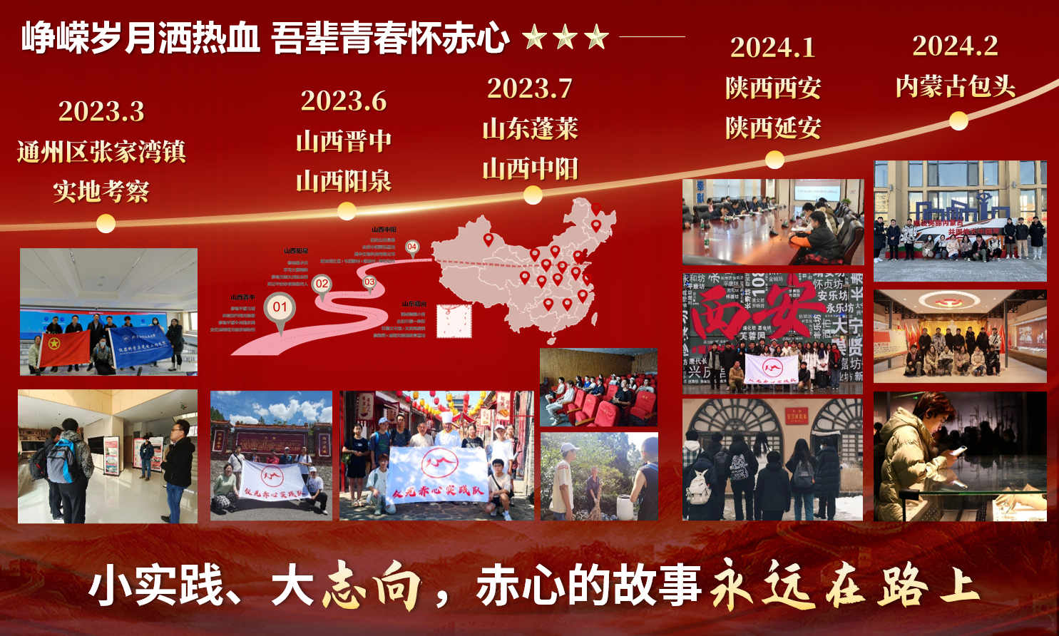 基层历练,知深行远。只有深入基层一线,才能更好地认识社会融入社会。从一个人到一群人,从实践新人成长为队伍核心,班级的社会实践队伍不断壮大,共10人加入仪光赤心实践队。自2023年寒假到2024年寒假,走访4座省份、7座城市,班级成员直接参与产出21支实践视频,各平台累计浏览量突破10万次,带领队伍连续两次获评校级社会实践二等奖,并带动公司、公司累计200余人参与到实践当中去。