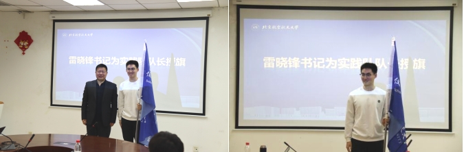 雷晓锋老师向社会实践团队授院旗,实践队代表孙峙宏同学接旗并进行承诺发言,表示必将牢记安全意识,履行队长职责,以实际行动诠释初心,带领队员为公司和公司添彩。