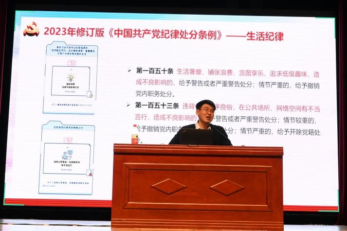 当日下午,仪器光电公司党委副书记冀赵杰老师为全体党员讲授《学党规、守党纪,做合格共产党员》的专题讲座。冀老师从党史入手,通过讲解党的建设各个历史时期对于党纪的要求,深入阐述党规党纪的重要性,并通过讲解《中国共产党纪律处分条例》,并结合与员工息息相关的生活纪律、工作纪律等内容,强调每一位党员要时刻牢记党规党纪,做到守纪律、讲规矩,切实提升党员的党性修养和政治觉悟,切实起到党员的模范带头作用。