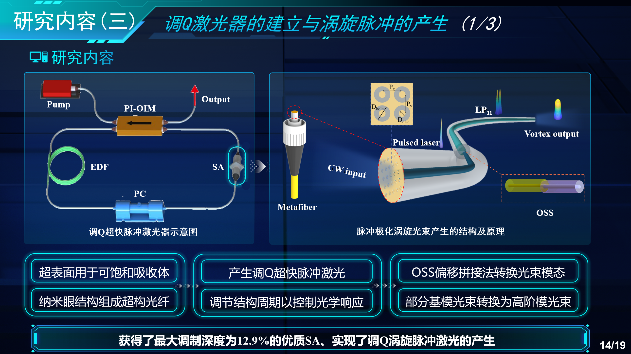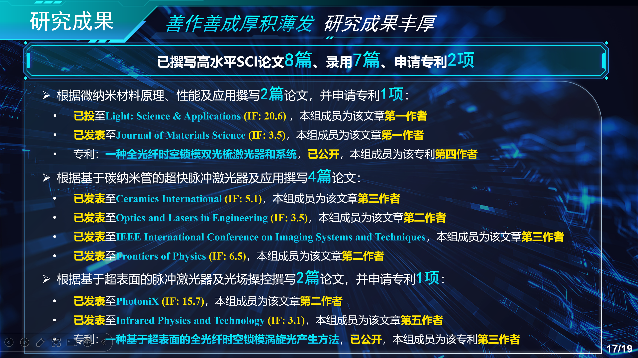 本项目旨在探索微纳米材料作为可饱和吸收体的非线性光学特性及其在激光光子学中的创新应用。研究内容主要包括三个方面:一是研究微纳米材料的非线性光学调制特性及其在超快脉冲激光器中的应用;二是基于碳纳米管材料,搭建了宽波段超快脉冲光频梳激光器,成功在1.5 μm和2 μm波段实现稳定的锁模输出与束缚态的产生,最终实现了基于色散管理的单腔双光梳激光器;三是利用超表面材料设计调Q脉冲激光器,创新性地提出OSS偏移拼接法,实现了脉冲偏振涡旋光的生成与检测,为光通信和光镊领域提供了新方法。项目成果显著,共撰写高水平SCI论文8篇,已发表7篇,申请国家发明专利2项,为超快光子学研究和应用提供了新思路和技术支持。