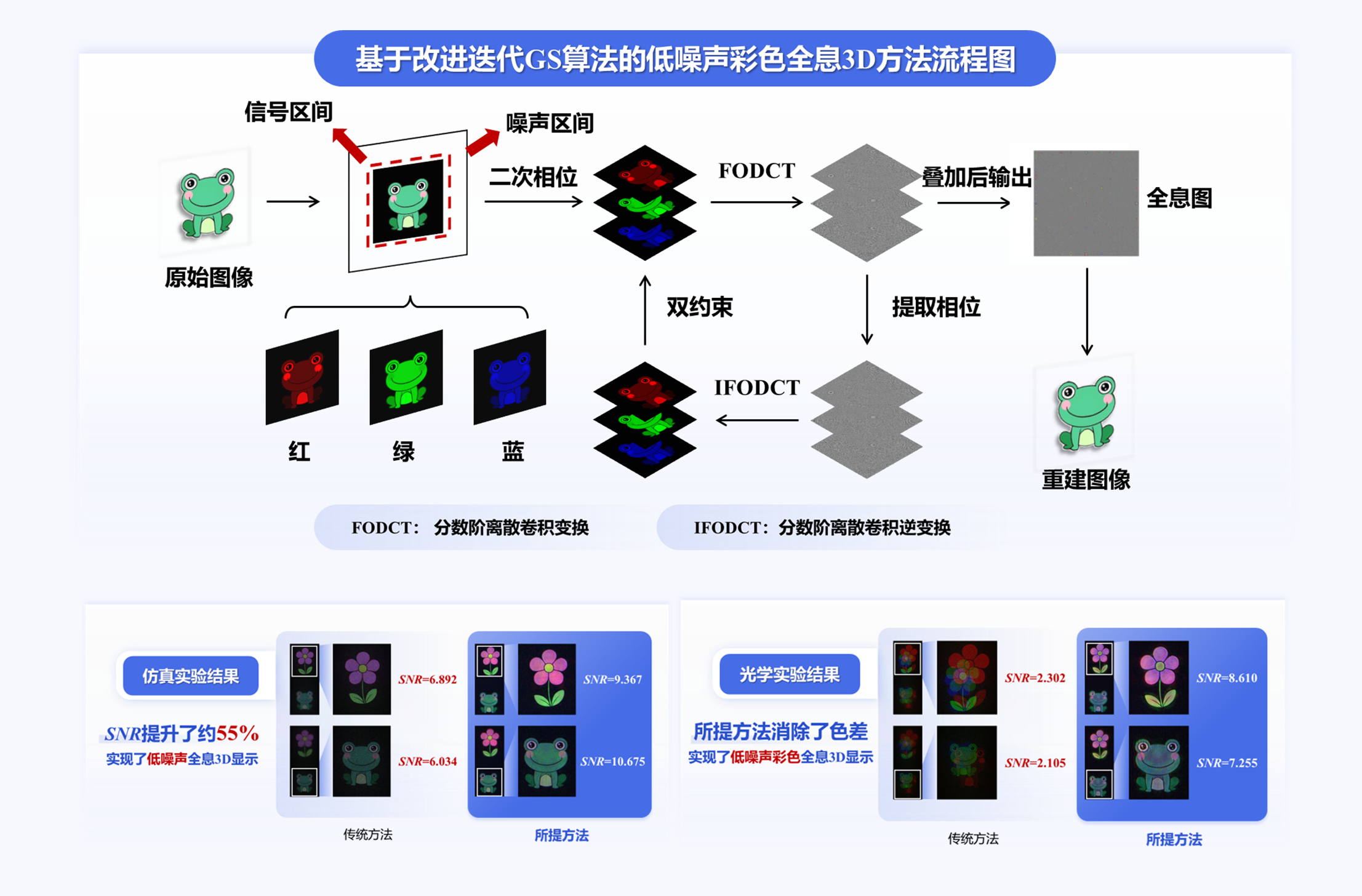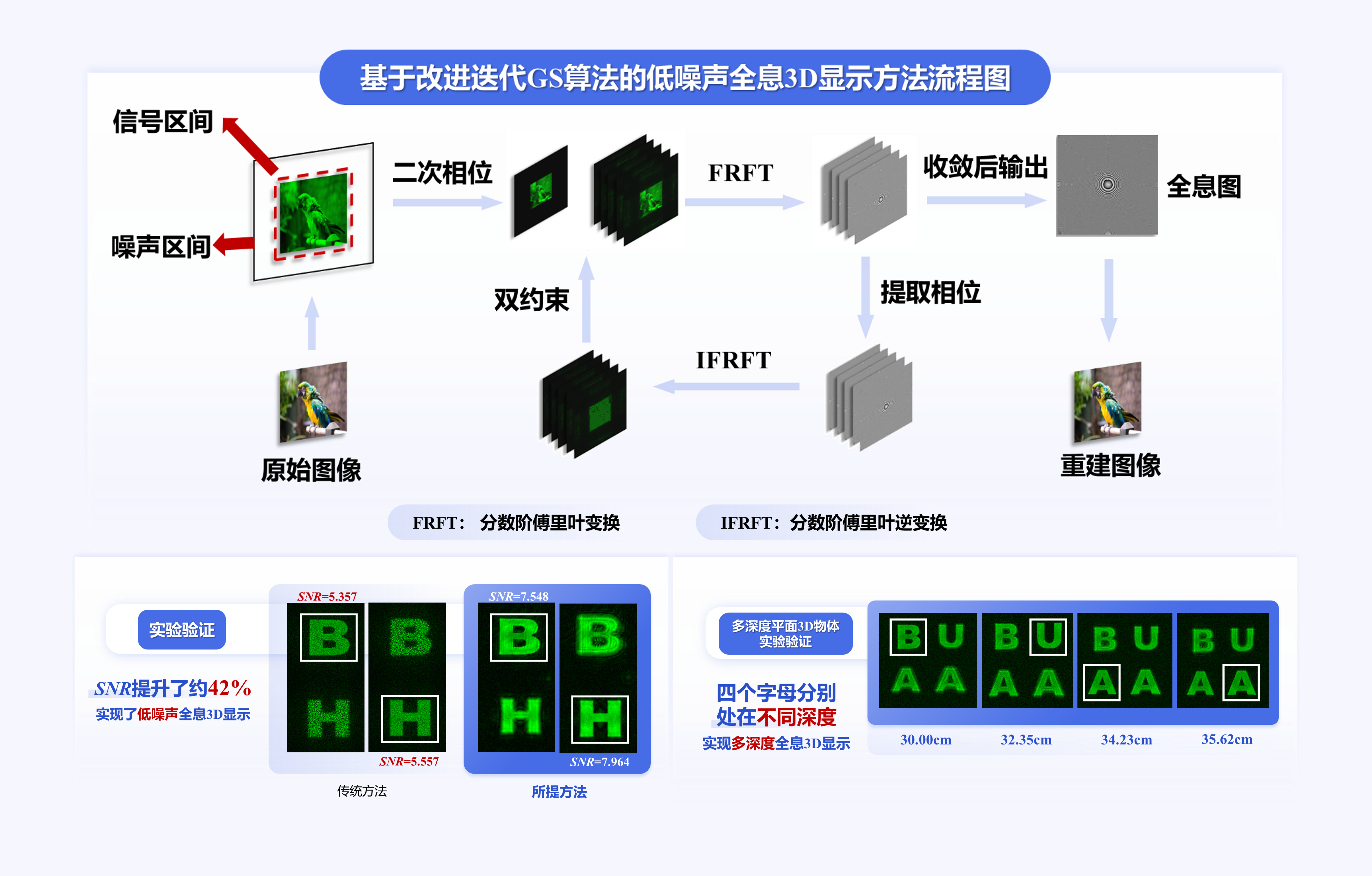 全息3D显示技术因散斑噪声与色差问题制约其应用。为抑制传统Gerchberg-Saxton(GS)算法在傅里叶全息图再现中产生的散斑噪声,项目提出改进迭代GS算法,在迭代时对原始图像划分信号与噪声区间,并施加原始振幅与二次相位的双重约束,结合分数阶傅里叶变换重建多深度3D图像,使再现像信噪比较传统方法提升42%。针对彩色全息中光波差异导致的色差,项目进一步提出基于分数阶离散卷积变换的优化方案,利用其离散卷积特性消除色差,并通过图像缩放、参数调整及数字闪耀光栅优化显示质量,使再现像信噪比提升达55%。项目研究成果包括2篇SCI Q1区期刊论文(第一作者均为项目成员)及1项国家发明专利申请,为解决傅里叶全息3D显示的散斑噪声与色差问题提供了创新方法,有望促进全息3D显示的发展。