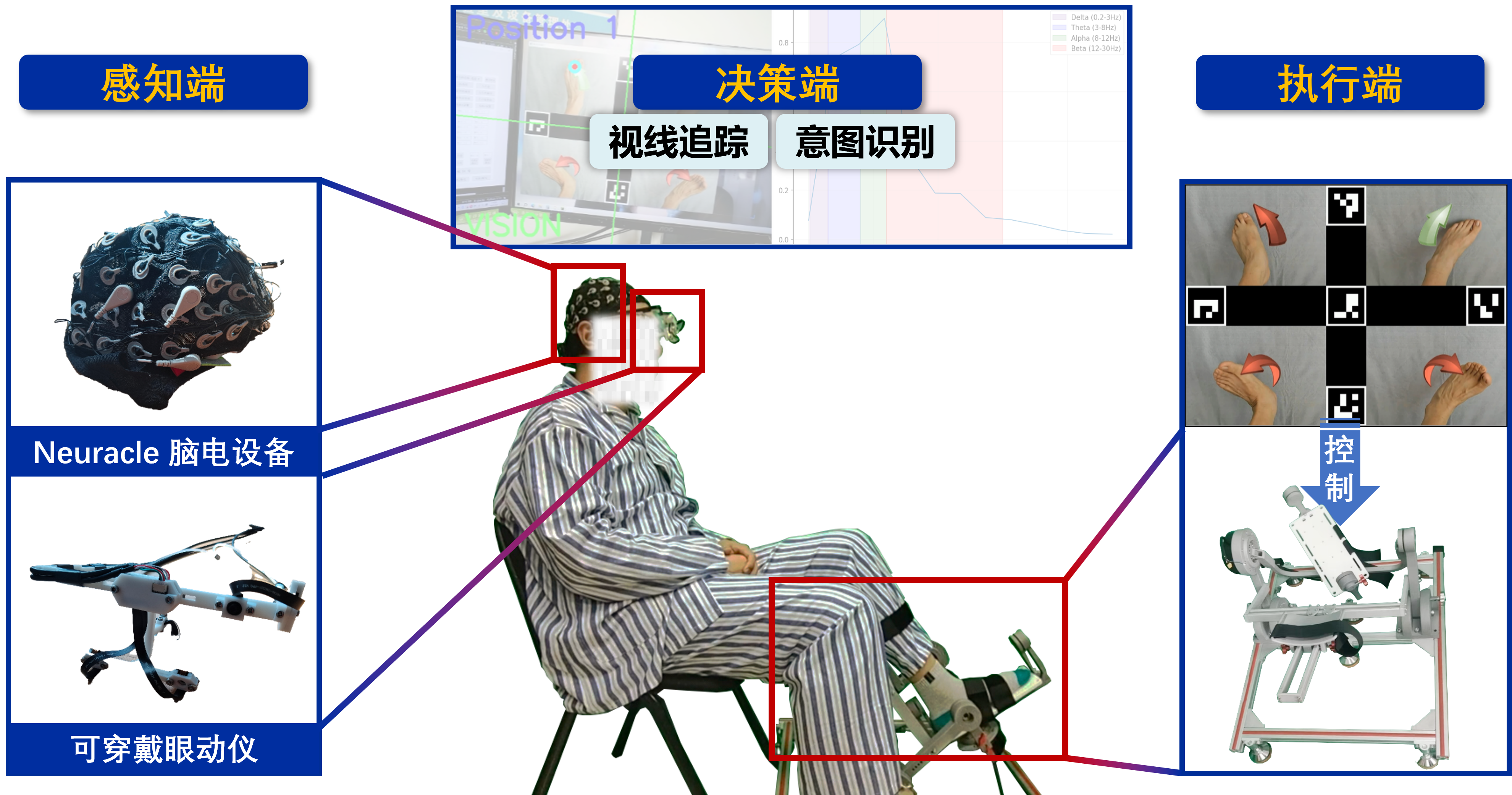 针对脑卒中后下肢运动功能障碍康复需求,本项目开发“眼动+脑电”双模态人机交互智能康复系统。以神经可塑性为理论基础,利用高精度眼动追踪与多尺度脑电解码技术构建多维度运动意图解析算法,驱动外骨骼执行足踝靶向训练,同时嵌入反馈机制以强化感官协同性,形成“感知-决策-执行-反馈”的闭环神经通路,为卒中康复提供数据驱动型干预范式,兼具临床转化与产业化能力。