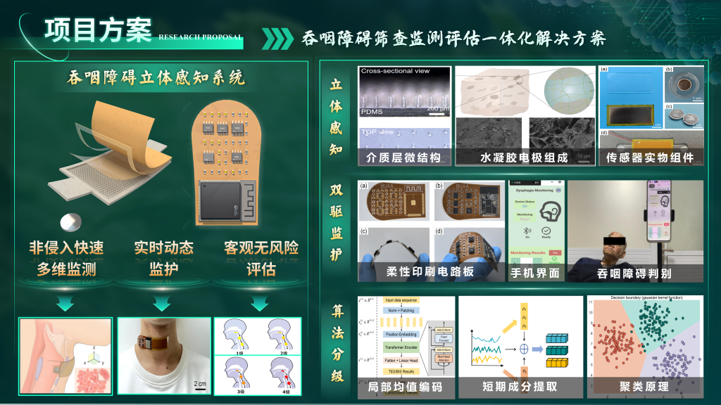 吞咽障碍作为一种功能性障碍普遍出现在老年人及慢性病患者中,易造成致死性肺炎。本项目针对吞咽障碍筛查监测评估的痛点,提出一套集立体感知、长效监护、精准评估三大功能于一体的便携可穿戴系统——智咽。通过摩擦电传感与生物阻抗传感协同构建"表皮位移-深层阻抗"的立体感知机制,结合核心硬件电路和双端交互平台构建完整系统,内嵌专门适配吞咽障碍分级评估的深度学习算法,解决临床痛点。构建了"系统研发-算法优化-临床验证"的完整链条,为吞咽障碍诊评提供了新一代智能医疗仪器解决方案。项目共计形成3项发明专利,3篇SCI论文(1篇接收,2篇在审)。