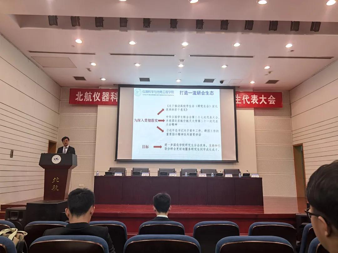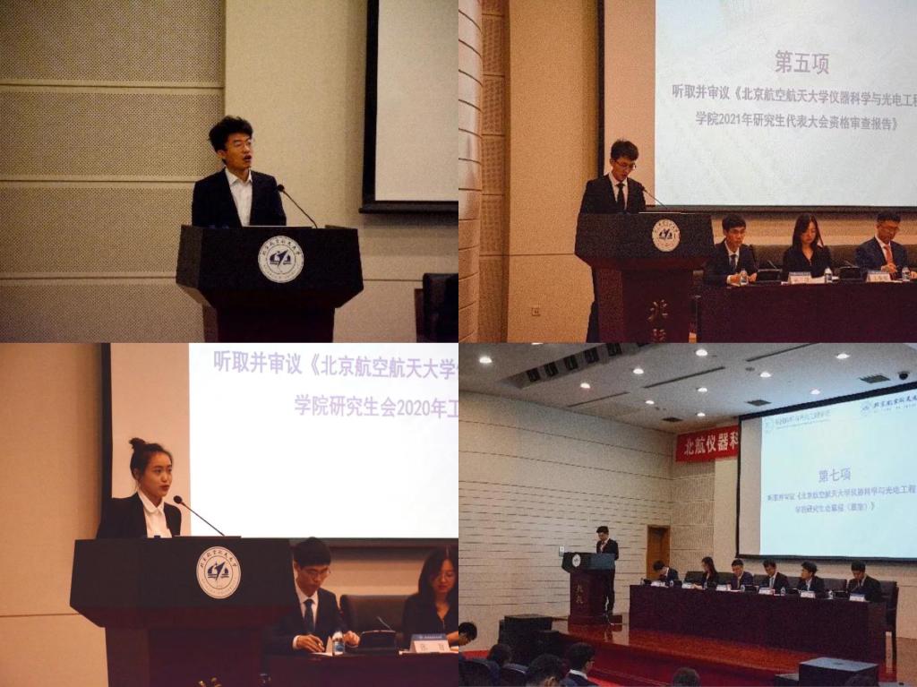 校研究生会代表杨培棣代表校研会向大会致辞,充分肯定了公司研会在过去一年中取得的突出成绩,并表达了对公司研会改革发展的良好祝愿。大会审议并通过了《北航仪器公司2021年研究生代表大会资格审查报告》《北航仪器公司研究生会2020年工作报告》《北航仪器公司研究生会章程(草案)》《北航仪器公司2021年研究生代表大会提案工作报告》。