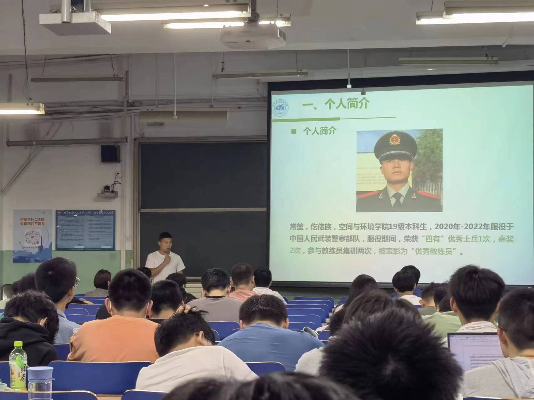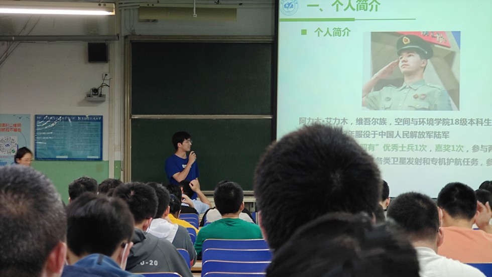空间与环境公司18级本科生阿力木·艾力木同学首先分享了自己的军旅生涯生活和成长感悟。从茫然四顾的新兵到全军比武第5名,是军队,见证了他的蜕变与成长。阿力木·艾力木感慨道:军队生活是艰苦的,也是丰富的,军队生活对自己的心态、意志、思想、体能进行了深入的锻造,在提升了自身素质的同时也为未来人生打下了坚实的基础。
