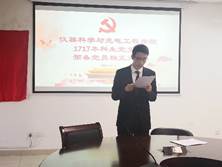会议最后,党支部书记冯天轩同志对全体党员提出了要求,希望全体党员能够时刻保持党员的先进性,遵守党的章程,履行党员义务,严守党的纪律,认真学习贯彻十九大精神并落实到行动中,“不忘初心,牢记使命”。在以后的学习生活中,要更加严格地要求自己,努力学习党的基本理论和基本知识,增强党员的责任意识,在工作中勇挑重担,努力成为一名出色的合格党员。