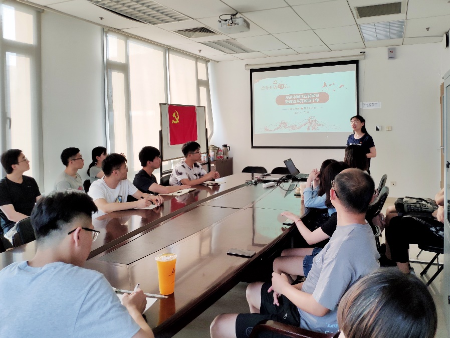 此外,王舒同志结合热播剧《大江大河》中的角色和年广九创办“傻子瓜子”等立体鲜活的故事,深入浅出地讲述了不同类型中国企业的发展历程,并以此点明改革开放在中国经济发展史当中的重要性。支部同学通过此次宣讲,不仅对改革开放中国企业的发展史有了新的认识,还对国家改革开放以来经济形势和变革有了更深层次的理解。