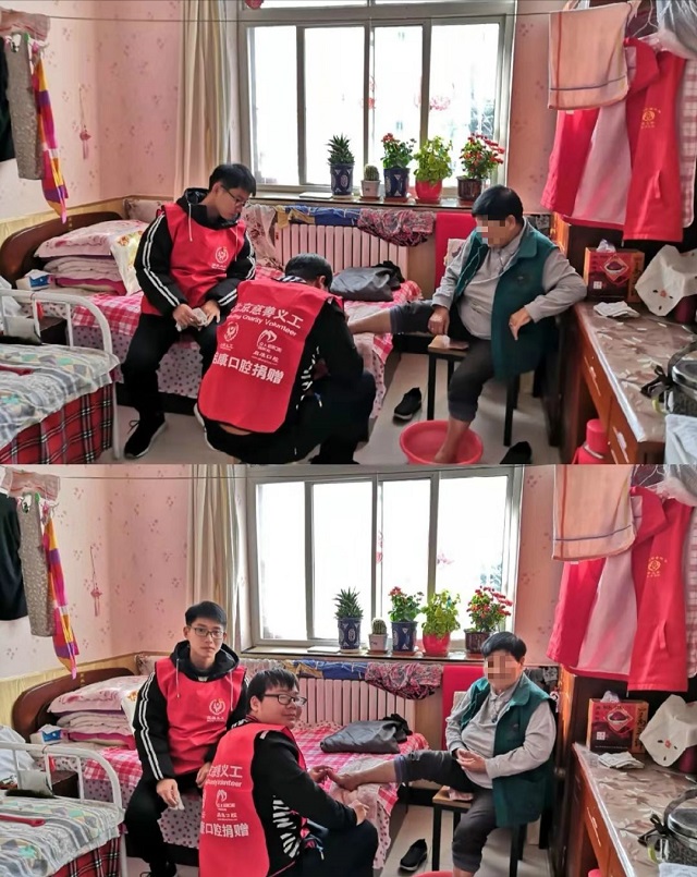 继日,为向支部优秀党员学习看齐,SY18173党支部黄建斌书记带领3名入党积极分子前往清心居敬老院参加志愿活动。抵达敬老院后,一位做了20多年志愿服务的大姐给大家做了简单培训。之后,大家为老人们修剪指甲、唱歌,当志愿者们唱起《学习雷锋好榜样》的时候,老人们也情不自禁激动地唱了起来,脸上满是欢笑,眼里尽是热泪。
