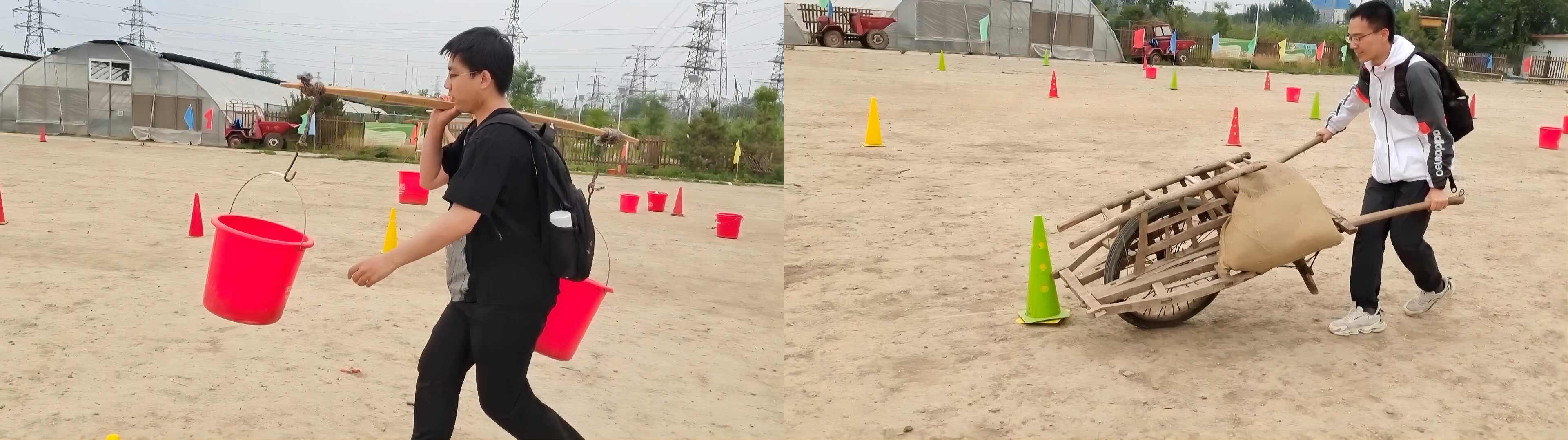接下来的项目是以比赛的方式体验推独轮车和挑扁担。这些古老而重要的农业工具,在现代技术的背后凝聚着历史的智慧。同学们发扬自己的团队合作精神,齐心协力,以最快的速度推动独轮车、挑扁担。过程中,有人扁担脱落,也有人的独轮车翻车,但大家都克服了困难,在此起彼伏的加油呐喊声中完成了这次体验。