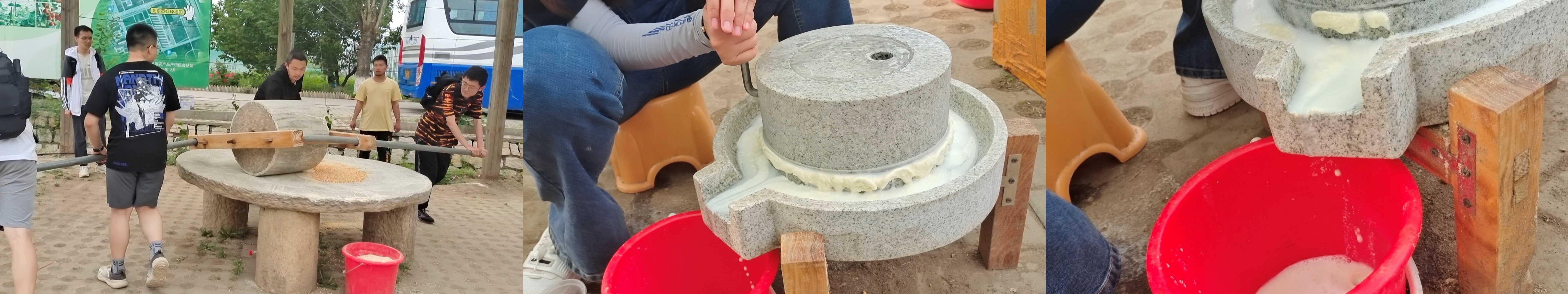 与磨玉米面不同的是,磨豆浆使用的是小型石磨。工作人员将同学们重新分组,每组两人,一个人负责向石磨中添豆子、加水,另一人则负责研磨。随着石盘的旋转,黄豆逐渐被研磨成细腻的豆浆,并散发着诱人的清香。通过这次研磨豆浆的体验,同学们不仅学会了如何使用石磨,还体会到了每份粮食的来之不易。