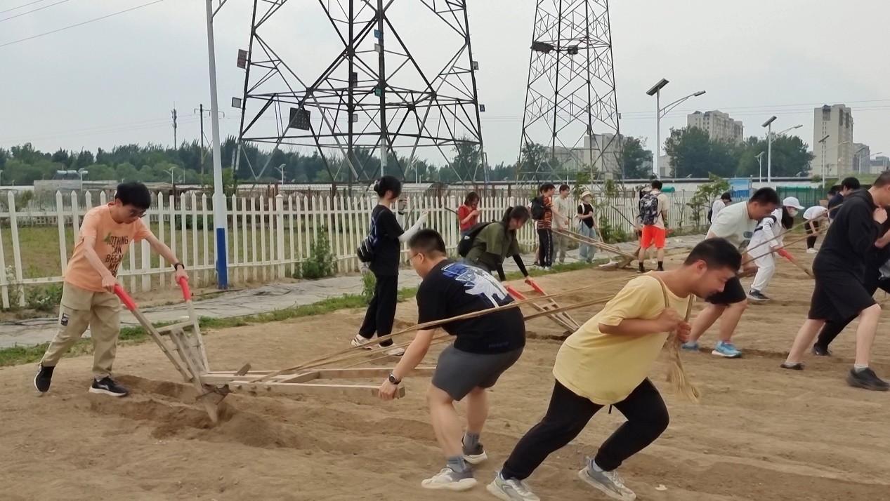 活动开始前,工作人员将同学们进行了分组,并详细地介绍了耕地、播种的步骤和技巧。听完工作人员的讲解,同学们迅速地融入了基地的工作氛围,小组内的几位同学,有人在前面拉犁,有人在后面调整方向,刚开始时大家对于木犁的使用方法还有些生疏,但随着工作人员的指导更正和一遍遍的练习,同学们愈发娴熟,原本平坦的土地上被犁出一道道沟壑。随后,大家又投身于播种的任务中,认真地学习种植技巧,有的人负责撒种,有的人负责盖土。整个过程中,工作人员与同学们互动频繁,他们向同学们传授了农民的智慧和经验,让大家更好地理解和尊重农民的辛勤付出。每个人都深刻体会到农活的艰辛与劳累,同时也感受到农民对大地的深情和感激。