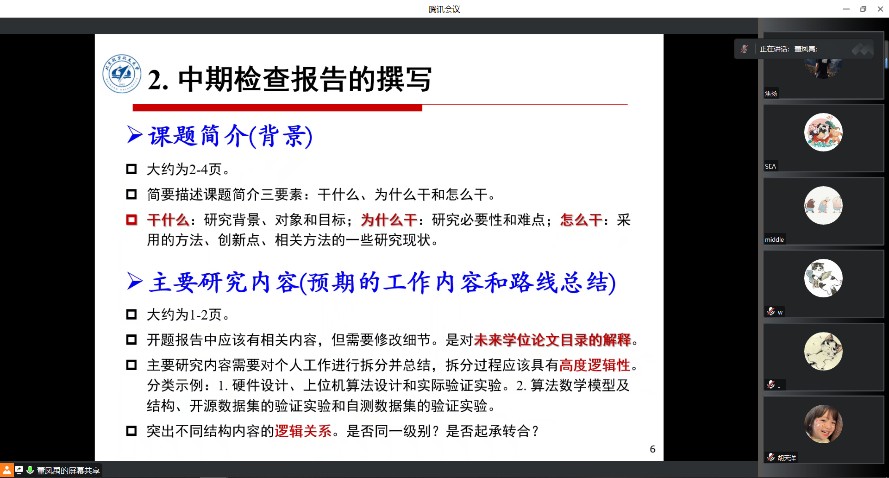 指导会上,卢旭鹏师兄的讲解结合自身实际紧扣要点,现场的同学们全神贯注,互动环节的氛围十分活跃。卢旭鹏师兄从中期检查的目的、中期检查报告的撰写以及中期答辩PPT的制作三个方面对硕士中期检查作了详细的讲解和分享。卢师兄先简要概述了中期检查的目的,提纲掣领地说明了评审老师们关心的要点以及自身应该反思和提高的部分。接着重点说明了检查报告的撰写要点,依次介绍了背景、研究内容与路线、工作进展、总结和参考文献四个部分要注意的细节。最后,卢师兄以自己的中期答辩PPT为例,向同学们讲解了答辩PPT的大致结构、篇幅比例、排版格式等同学们最关心的问题。
