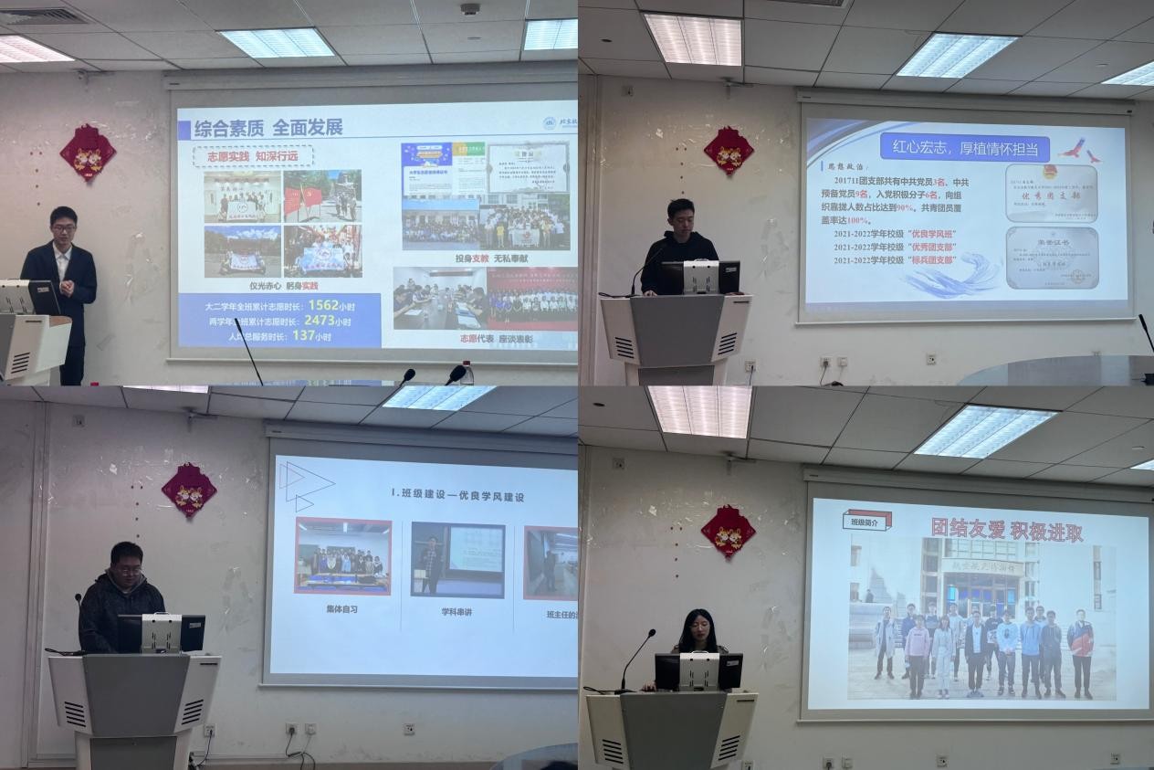 在答辩开始前,肖皓文老师宣读了本次答辩的评审细则。答辩过程中,各候选班级答辩代表分别围绕党团活动、学风建设、科研经历等多个方面进行展示汇报,对如何加强班级建设、营造良好的班风学风等活动开展情况进行详细阐述,展示了鲜明的班级特色,彰显了各班班集体团结向上、积极进取的精神风貌。